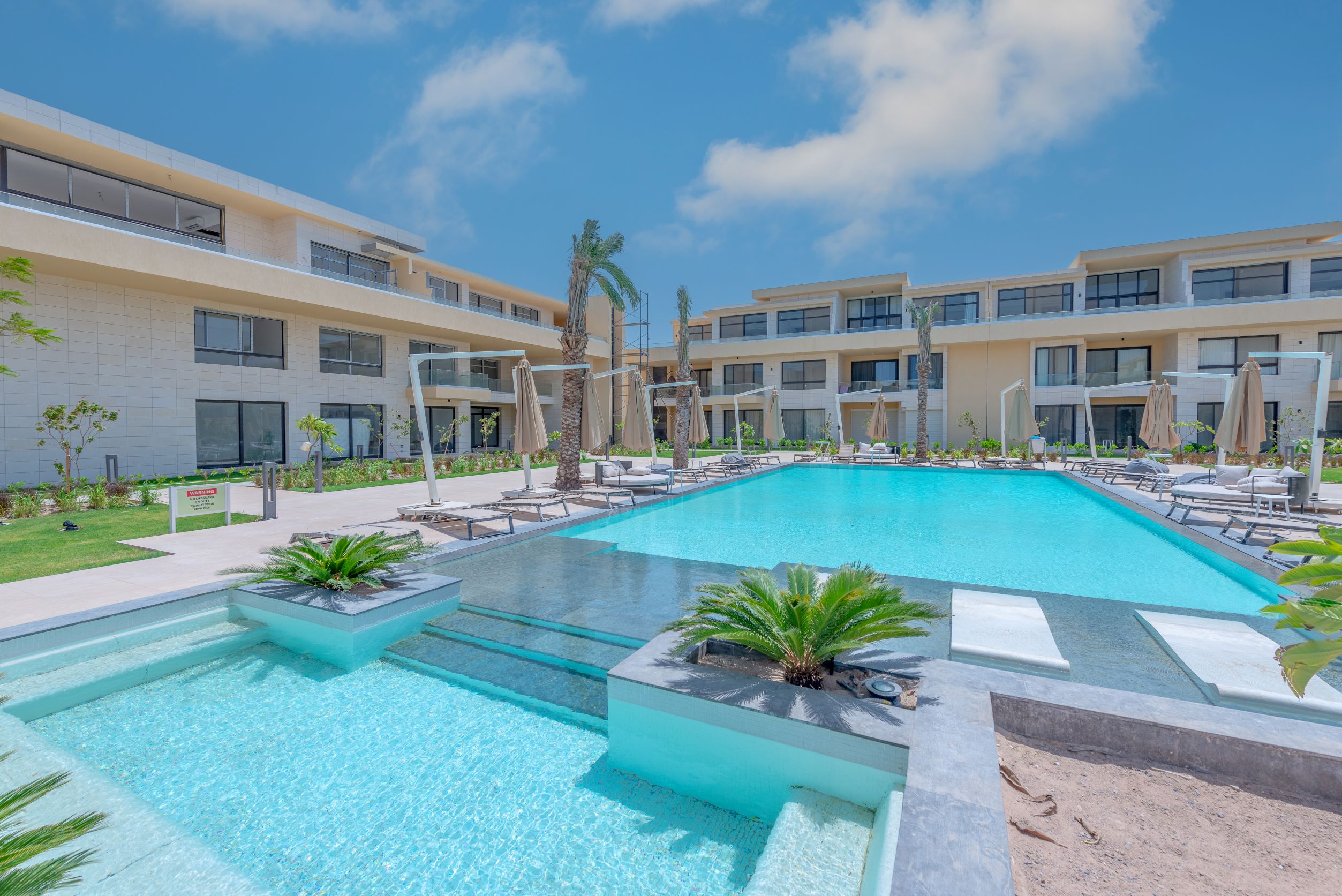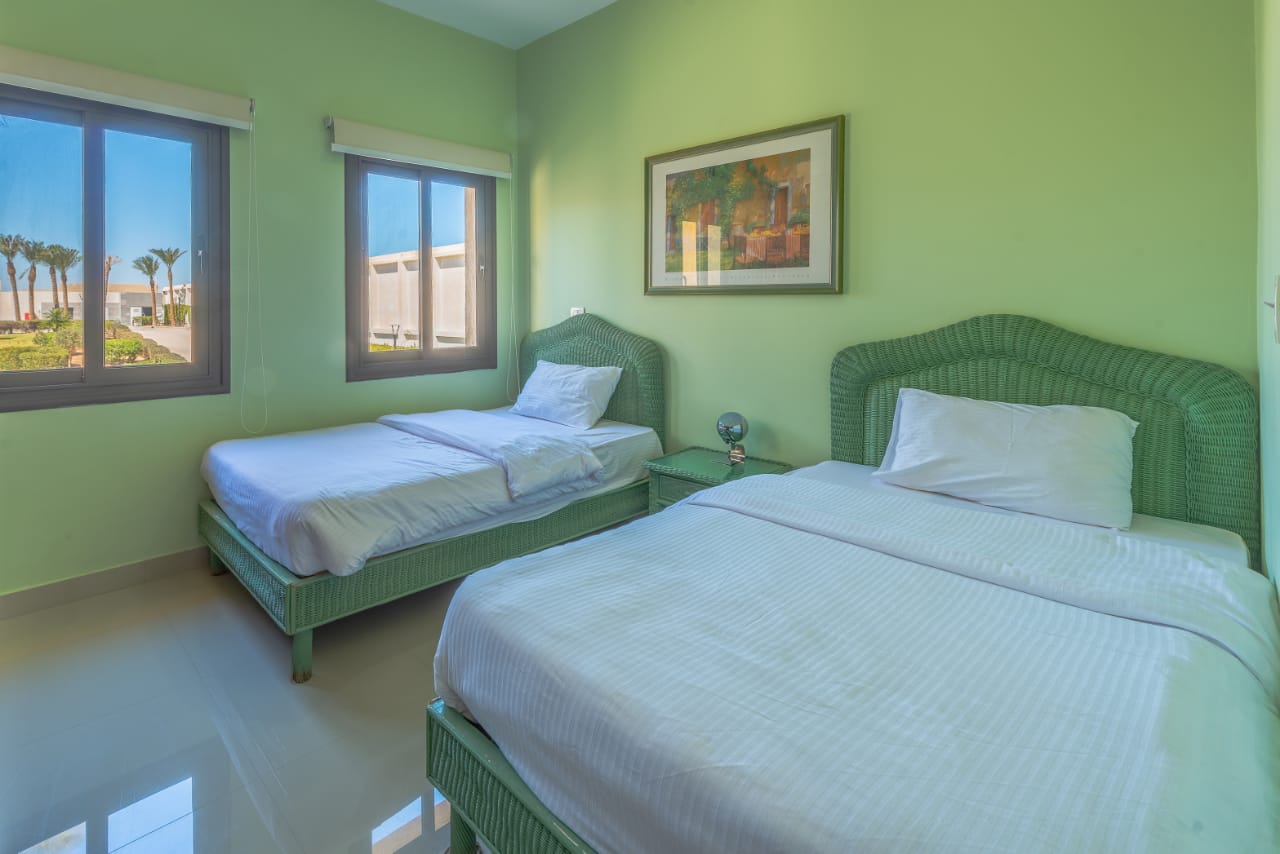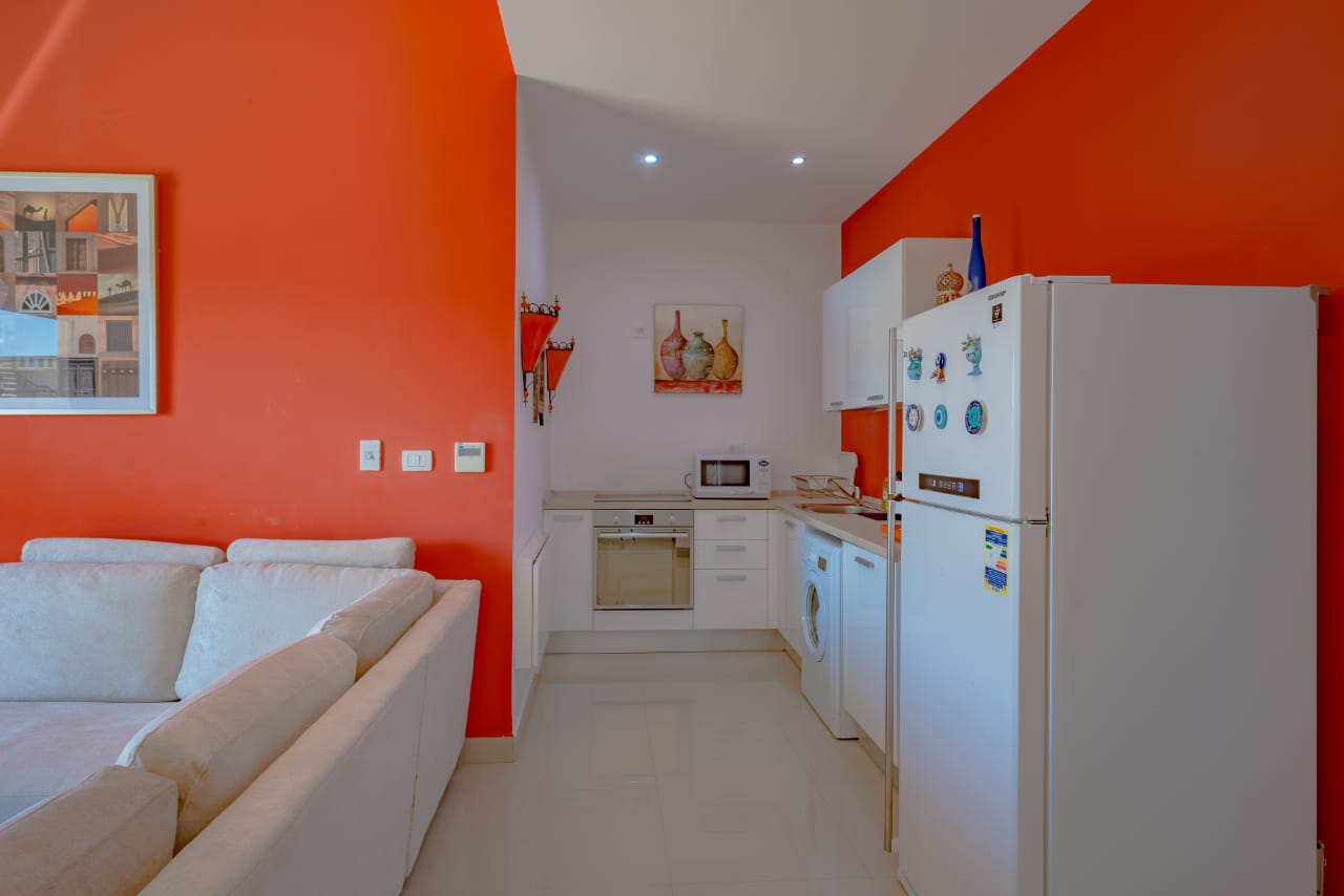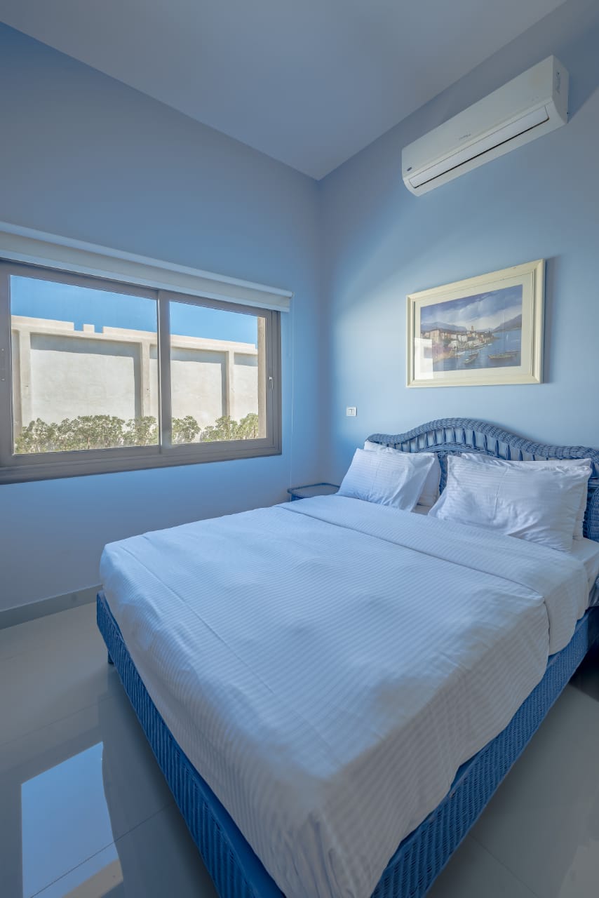 Apartment B9-F4 is located in Gcribs, El Gouna. A very fresh theme that comes with an access to the main pool. Guests enjoy our hotel services of housekeeping every 2 days, room service, Netflix and free Wi-Fi.