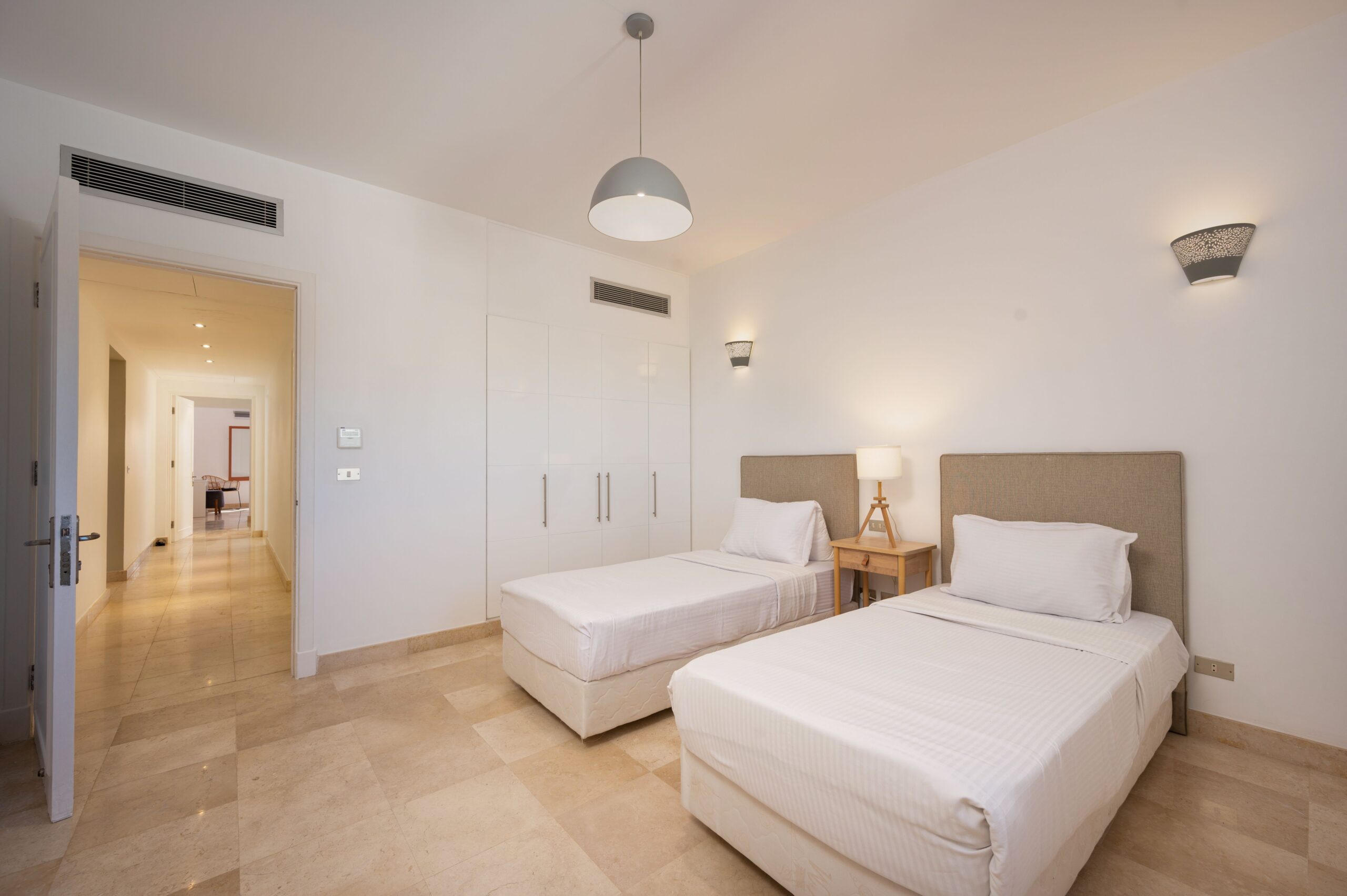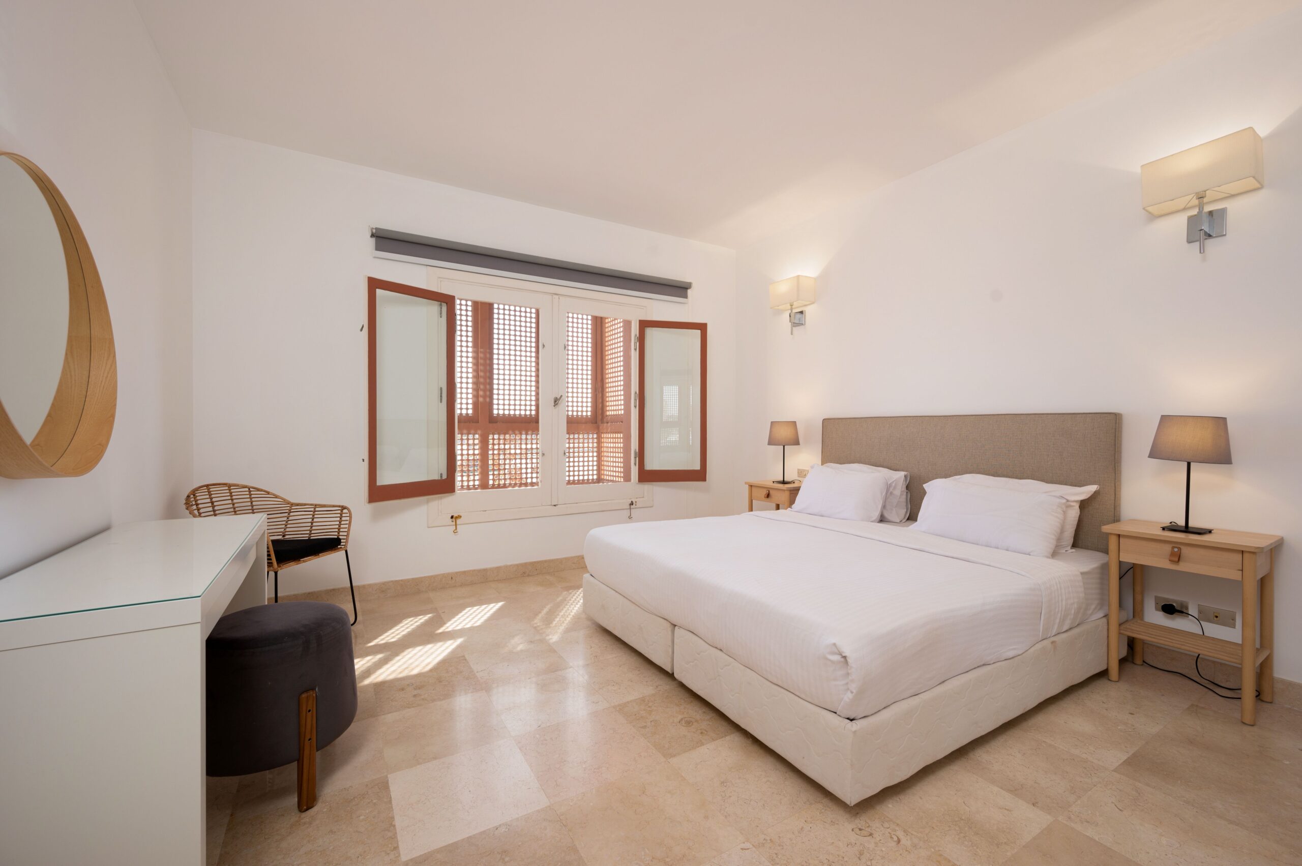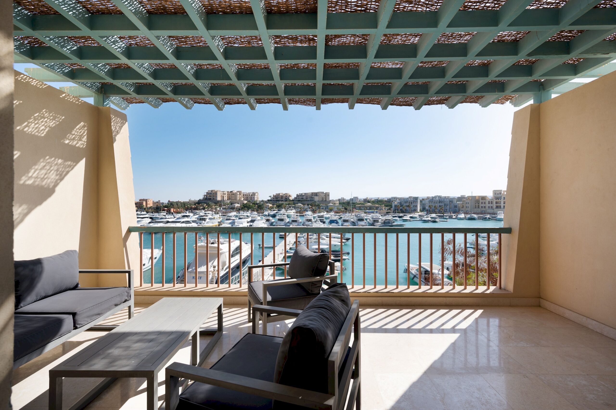 Apartment MB34 is located in New Marina, El Gouna. A very sleek design and a relaxing theme with a full sea view on first line to the beach. Guests enjoy our hotel services of housekeeping every 2 days, room service, Netflix and free Wi-Fi.